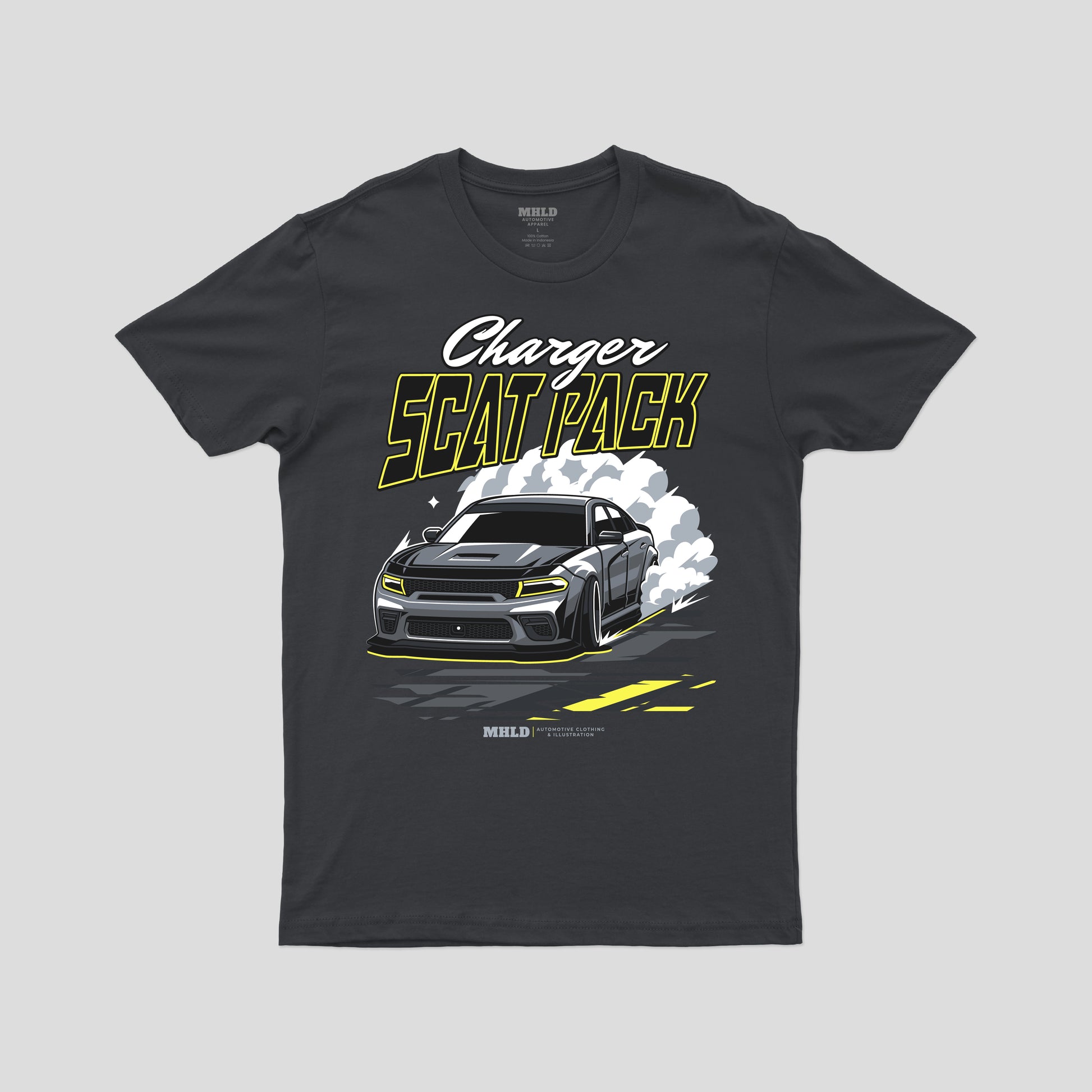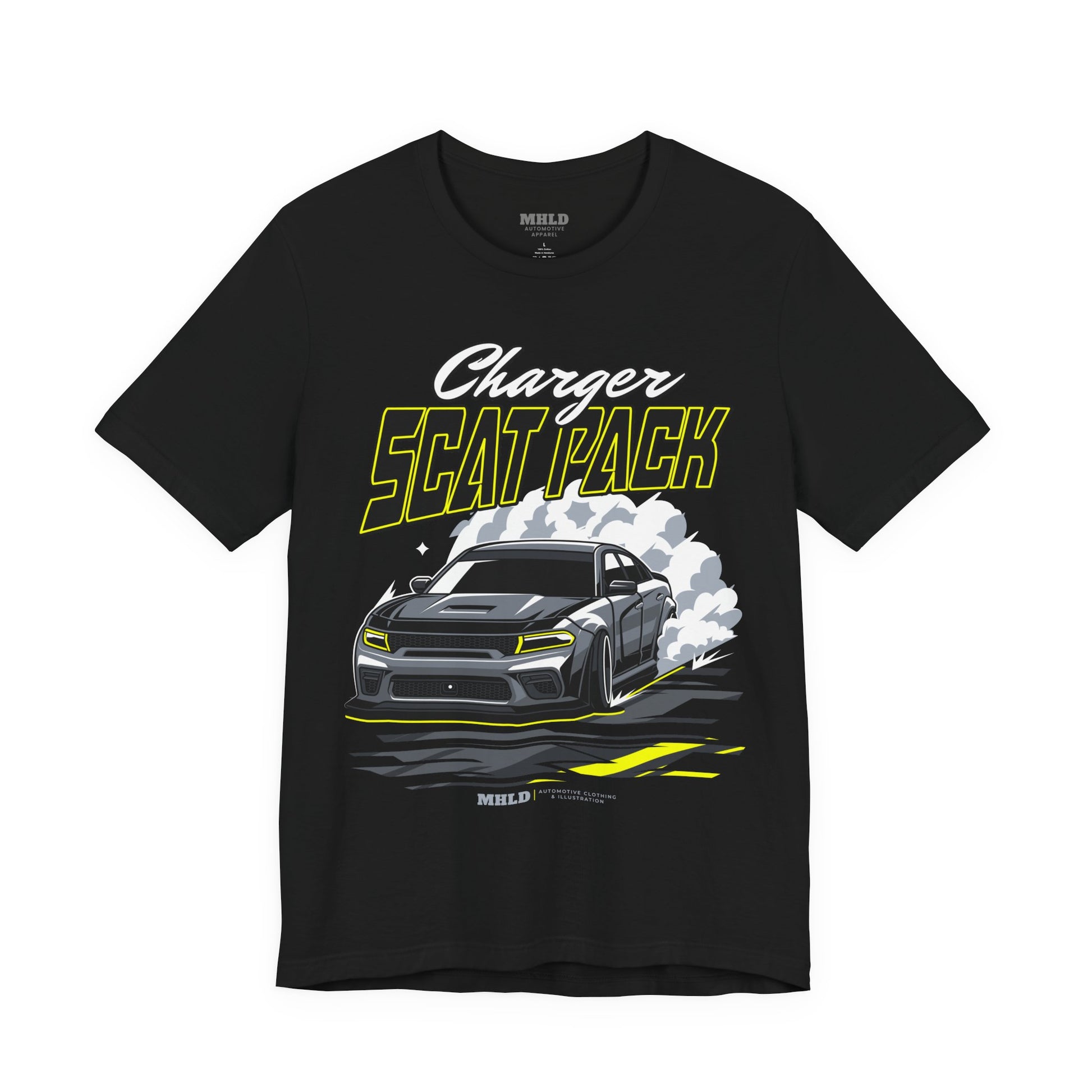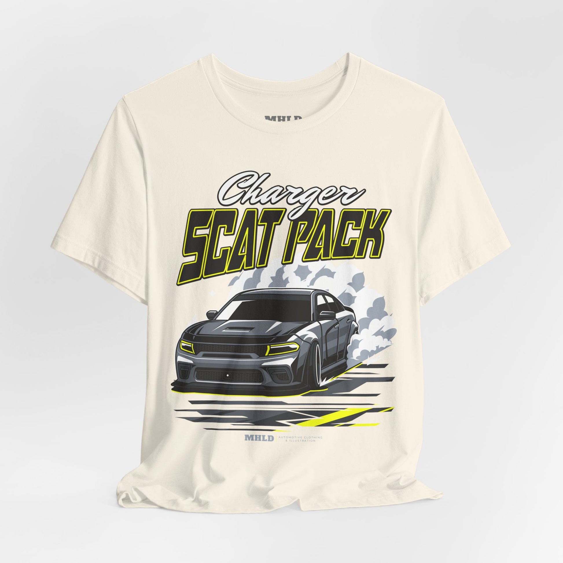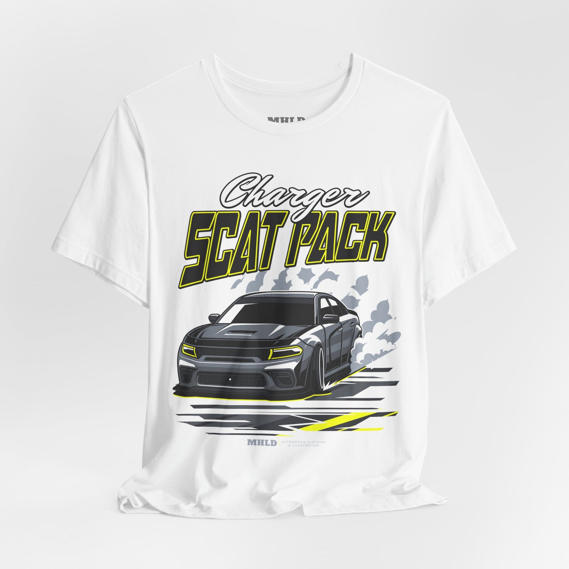 This lightweight jersey tee carries a bold, adrenaline-fueled vibe — a street-ready staple for anyone who lives for the rumble of American muscle. The front graphic shows a snarling Charger launching forward, smoke and tire marks trailing behind; the high-contrast, neon-accented palette pops on the breathable white cotton. Wear it to show allegiance to the garage, the track, or weekend cruising. The clean crew neckline and retail fit make it easy to layer under a jacket or wear alone, while the soft Airlume combed and ring-spun cotton keeps you comfortable through long drives and late nights. Ethically made and REACH certified, this tee blends performance details like shoulder tape and a ribbed collar with a bold automotive attitude.