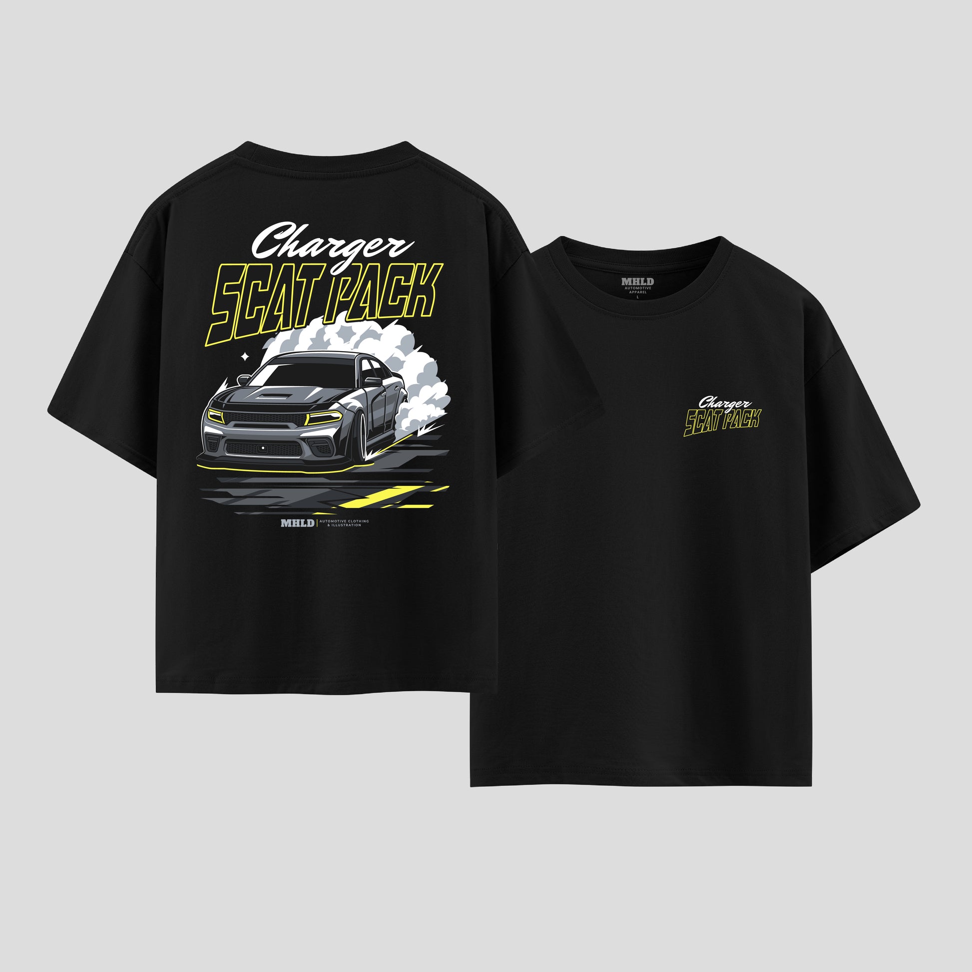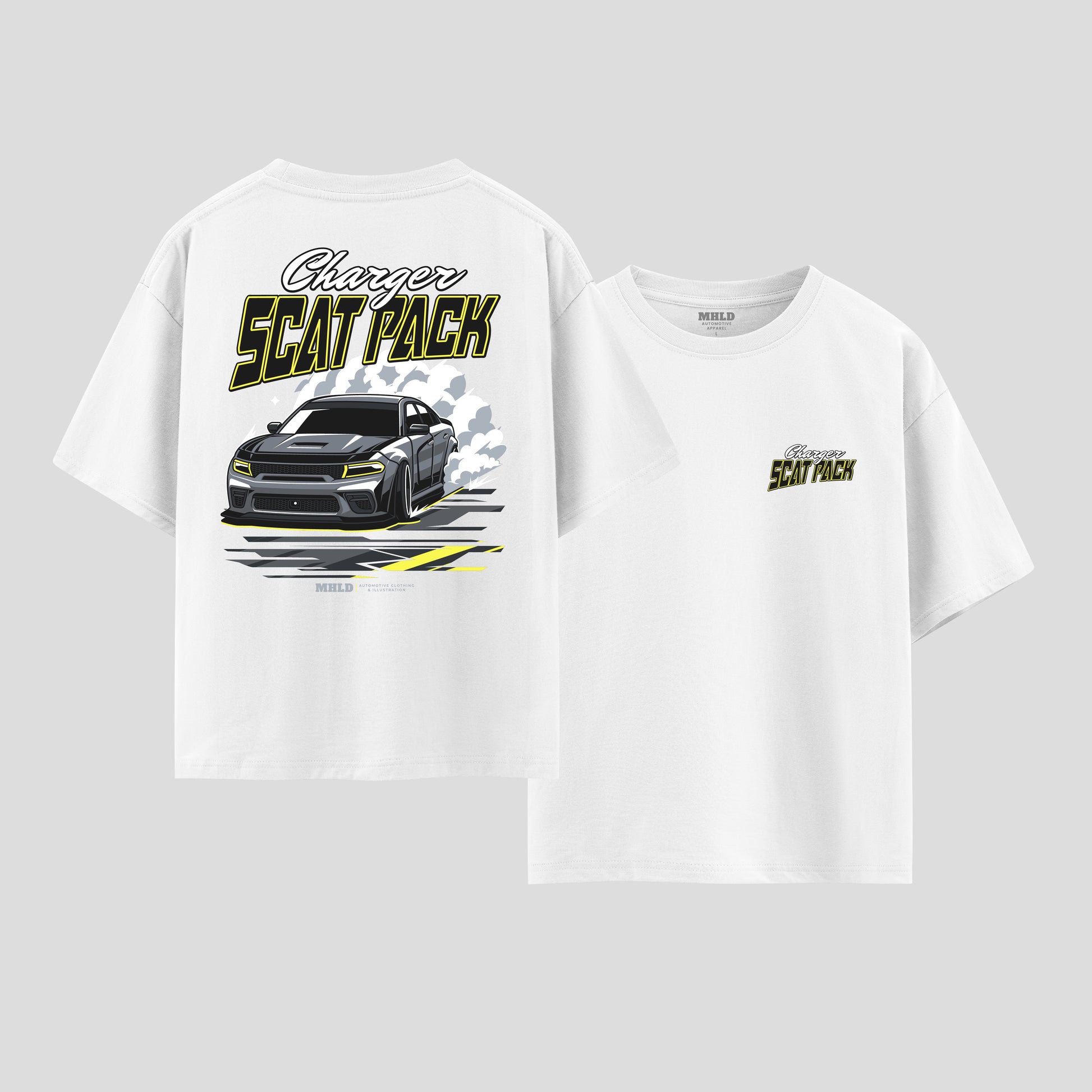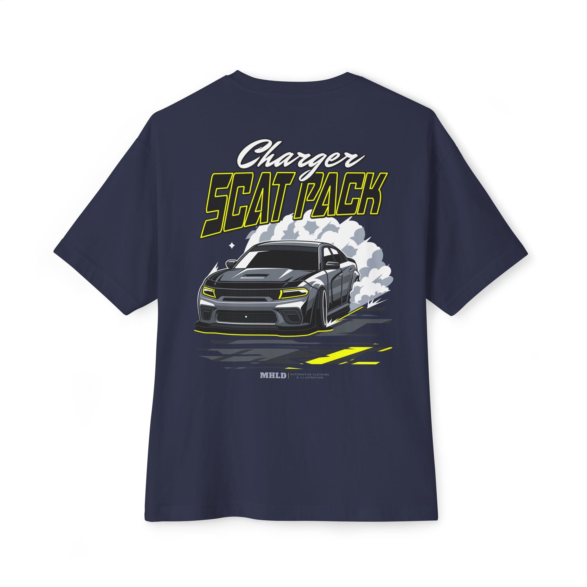 This oversized boxy tee feels like the garage after a late-night wrenching session — a little gritty, all adrenaline. The graphic bursts across the back: a slammed Charger in motion, tire smoke curling, and bold “Scat Pack” lettering that reads like a revving engine. Wear it to the track, to a meet-up, or when you want your weekend outfit to scream horsepower without trying too hard. The relaxed drop shoulders and medium-weight cotton hang loose over jeans or overalls, letting the print be the statement while you stay comfortable. Subtle chest script keeps the look balanced up front, so it works layered under a jacket or alone when the weather’s right.