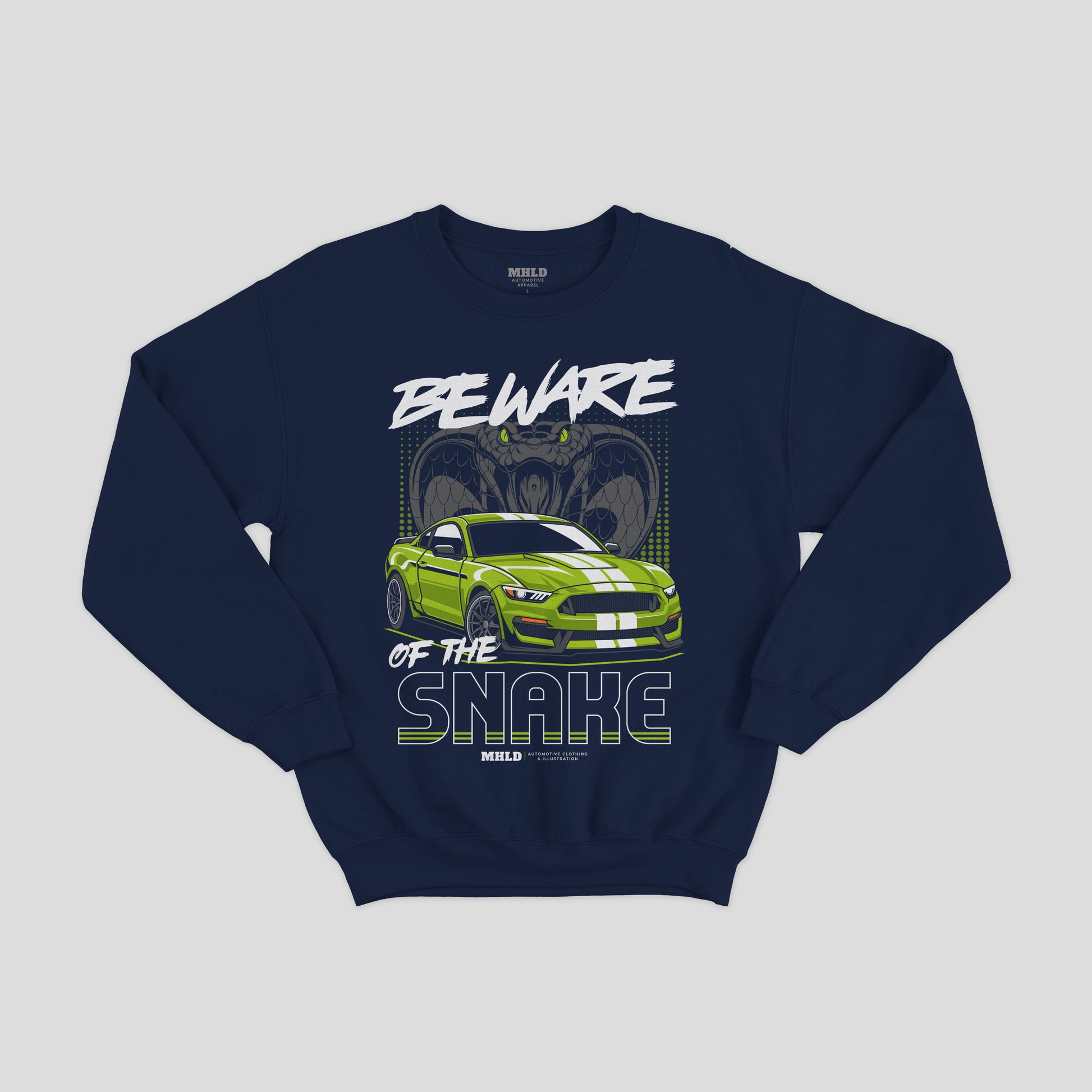 This crewneck channels raw street-racing energy with vintage muscle flair. A bold lime-green Shelby-style car sits front and center under the daring headline “Beware of the Snake,” with distressed graphics and shadowed cobra art that give a lived-in, track-day attitude. The medium-heavy fleece drapes comfortably while the ribbed collar and side seams keep the shape through repeat wear. Wear it to late-night meetups, garage wrenching sessions, or when you want to ride shotgun with adrenaline—this sweatshirt reads like a statement from someone who loves horsepower, open roads, and the hum of a well-tuned engine.