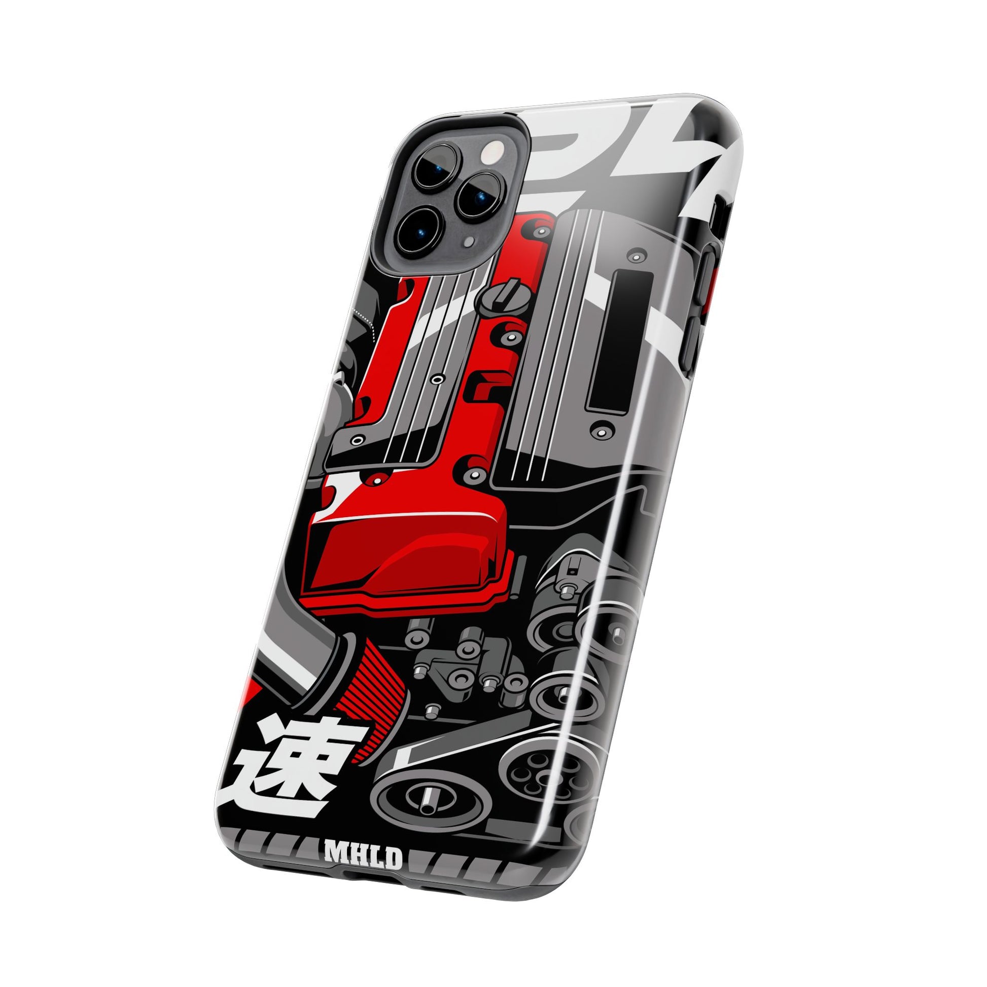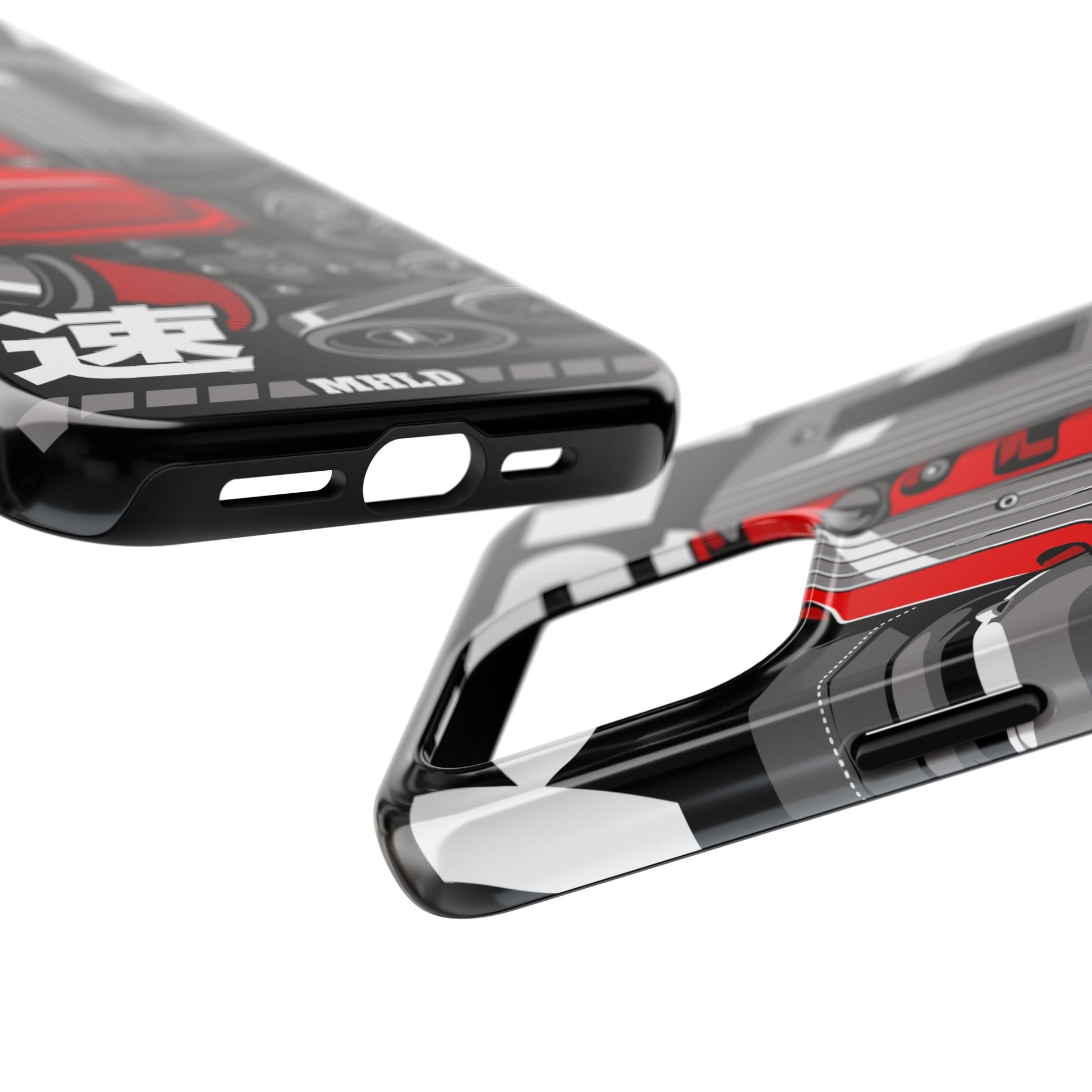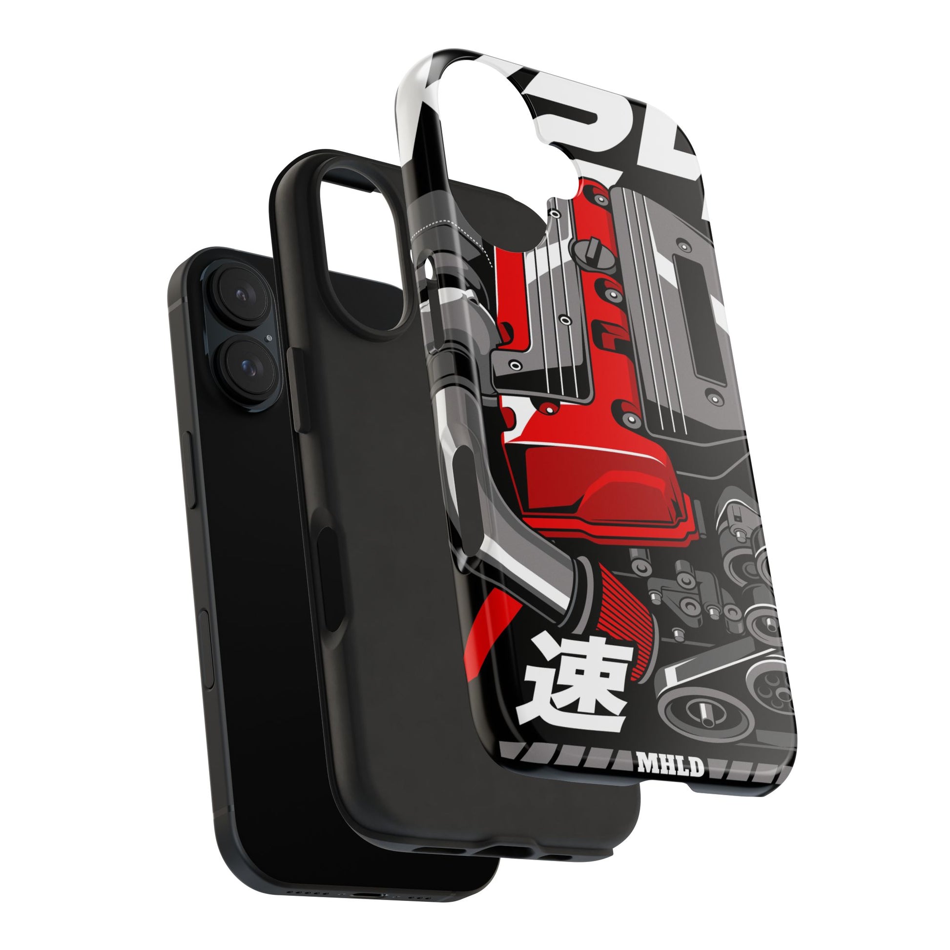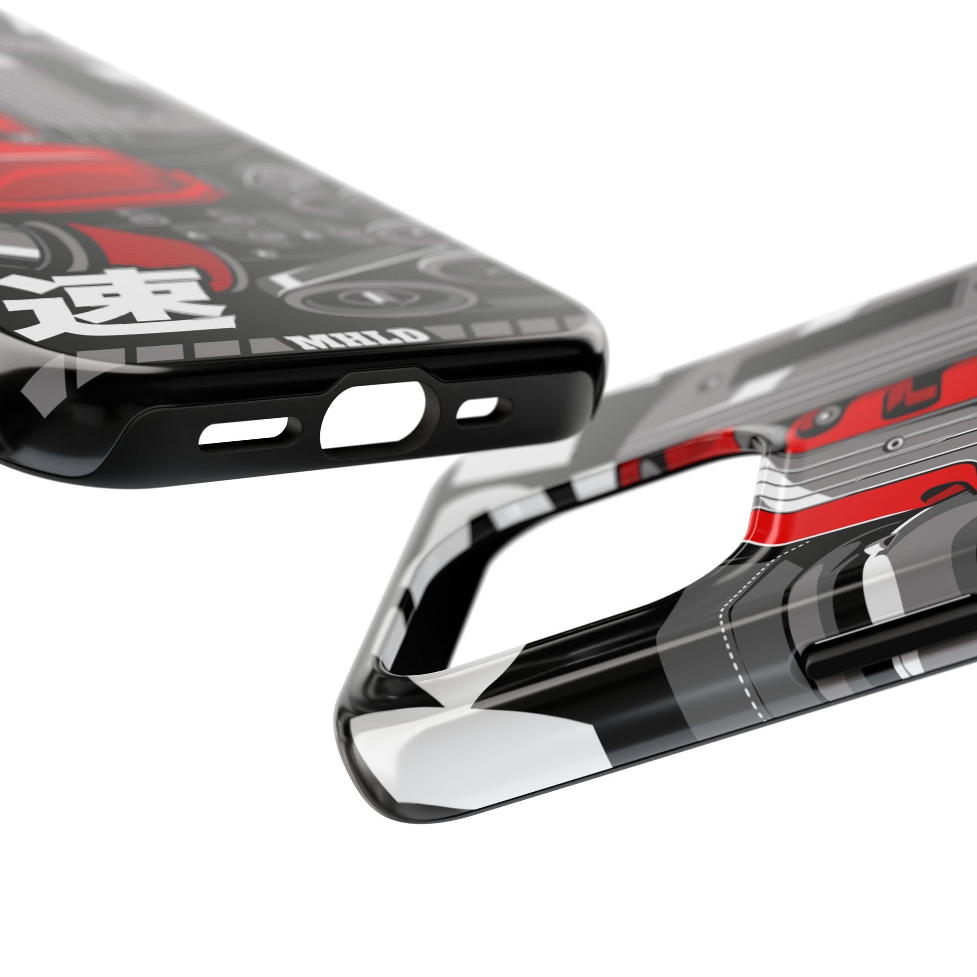 This slim, glossy phone case brings racing energy to everyday carry. Bold red engine components leap from a high-contrast black-and-white backdrop, styled with manga-inspired speed motifs for an unmistakable tuner-car vibe. The two-piece construction pairs a rigid polycarbonate shell with a flexible TPU liner that cushions drops while the raised bezel helps keep the screen safe when you set it face-down. UV protection keeps colors sharp through sun and weather, and the gloss finish makes the artwork pop. It slips onto compatible phones without adding bulk and supports wireless charging so you can juice up without removing the case. For drivers, gearheads, and street-style fans who want their phone to reflect their love of speed and mechanical detail, this case reads loud and clear.