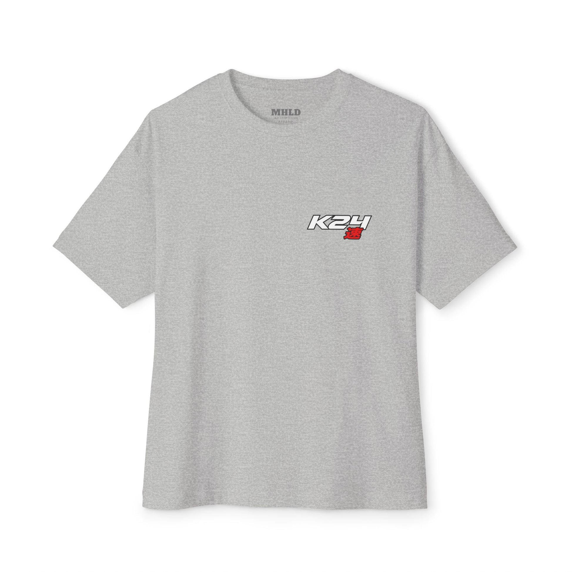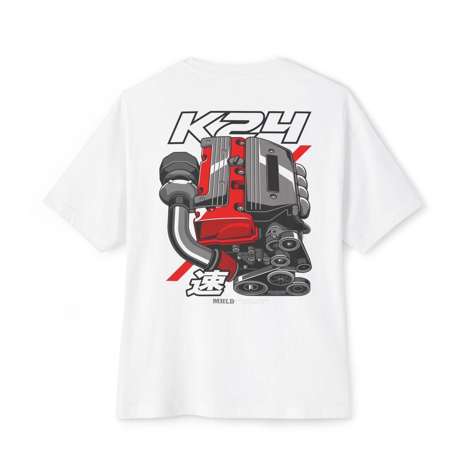 This oversized boxy tee brings the raw energy of street and track culture into everyday wear. The front features a small, subtle engine emblem over the heart, while the back bursts with a detailed, high-contrast illustration of a K24 engine — belts, turbo piping, and red valve cover rendered with crisp lines and bold accents. It sits roomy across the shoulders with dropped sleeves, creating that relaxed, thrown-on look that pairs with layered jackets or tapered joggers. Wear it to car meets, late-night garage sessions, or casual days when you want your gear to speak to a love of builds, torque, and hands-on craft. The soft combed cotton and medium-weight fabric give it structure without feeling stiff, so it hangs cleanly whether you’re leaning on a hood or rolling out after a wrenching session.