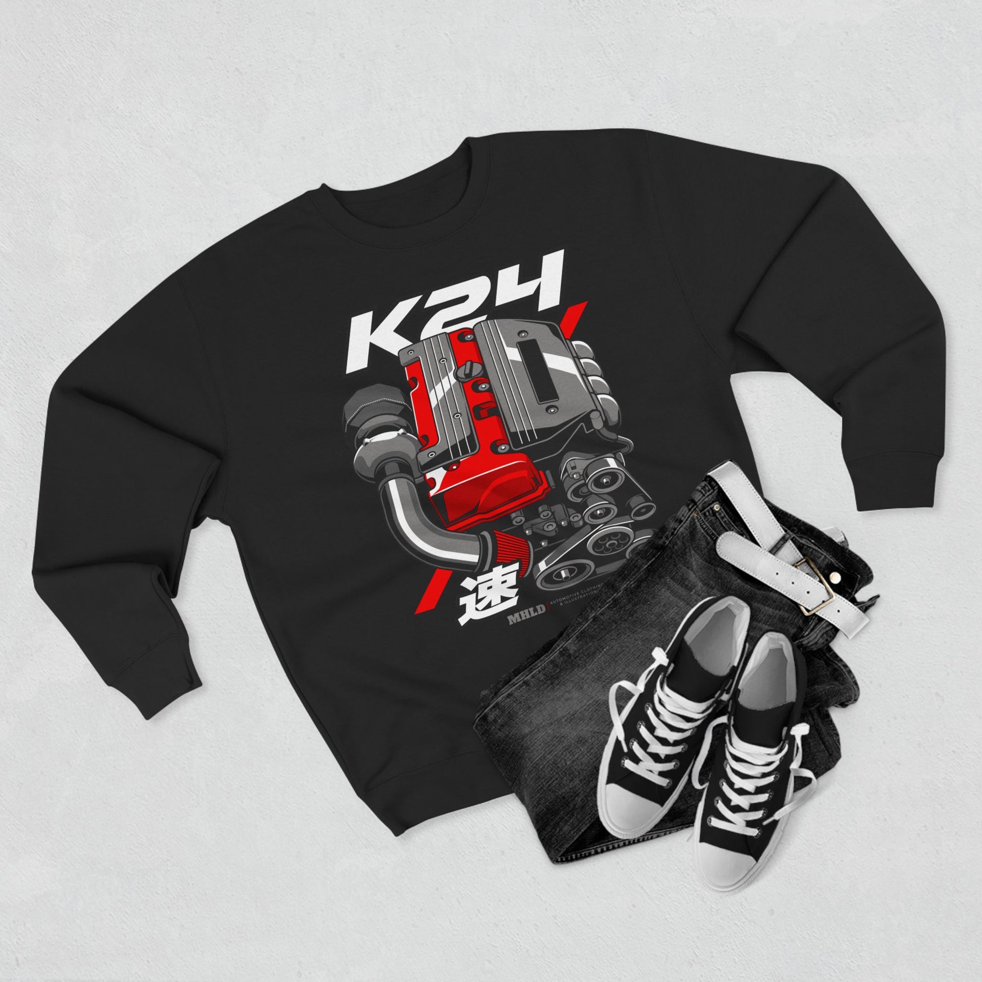 This crewneck brings the raw thrill of a tuned engine into everyday wear. A bold, stylized engine illustration — detailed pistons, intake piping and a red valve cover — sits center chest with racing accents and Japanese kanji for ‘speed’. It reads like a badge of late-night wrenching sessions, impromptu meets, and the quiet pride of a car lover who knows how things should sound and feel. The medium-heavy fleece holds the print’s vibrancy while the relaxed, regular fit layers easily over tees when the air cools. Wear it to the garage, to a local car meet, or on a drive where the road finally opens up. It’s for the enthusiast who wants a subtle statement that speaks fluent motorhead.