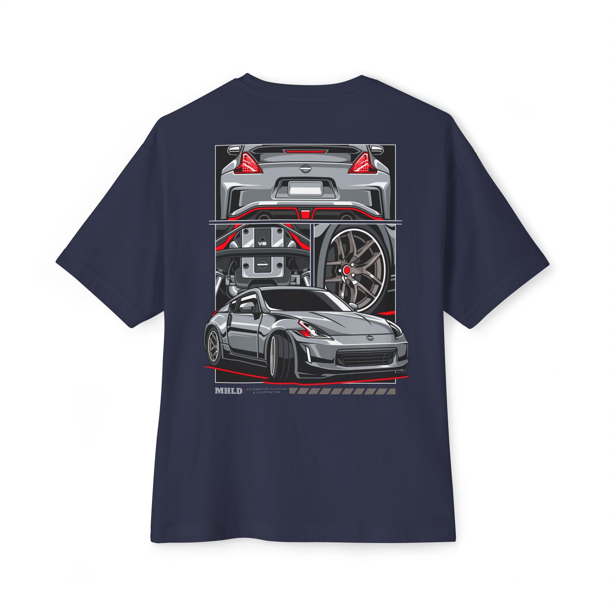 This oversized boxy tee carries the low, throaty hum of a midnight drive. The graphic captures a sleek sports car from multiple angles — rear view, wheel close-up, and a confident three-quarter stance — rendered in crisp, automotive-inspired lines with pops of red. The relaxed silhouette and mid-weight cotton feel like the kind of shirt you pull on before heading out to a meet or a late-night cruise. It layers cleanly under a jacket or wears alone to let the bold back print speak for itself. Wear it with worn denim and sneakers, and you’ll feel like you’re already in motion.